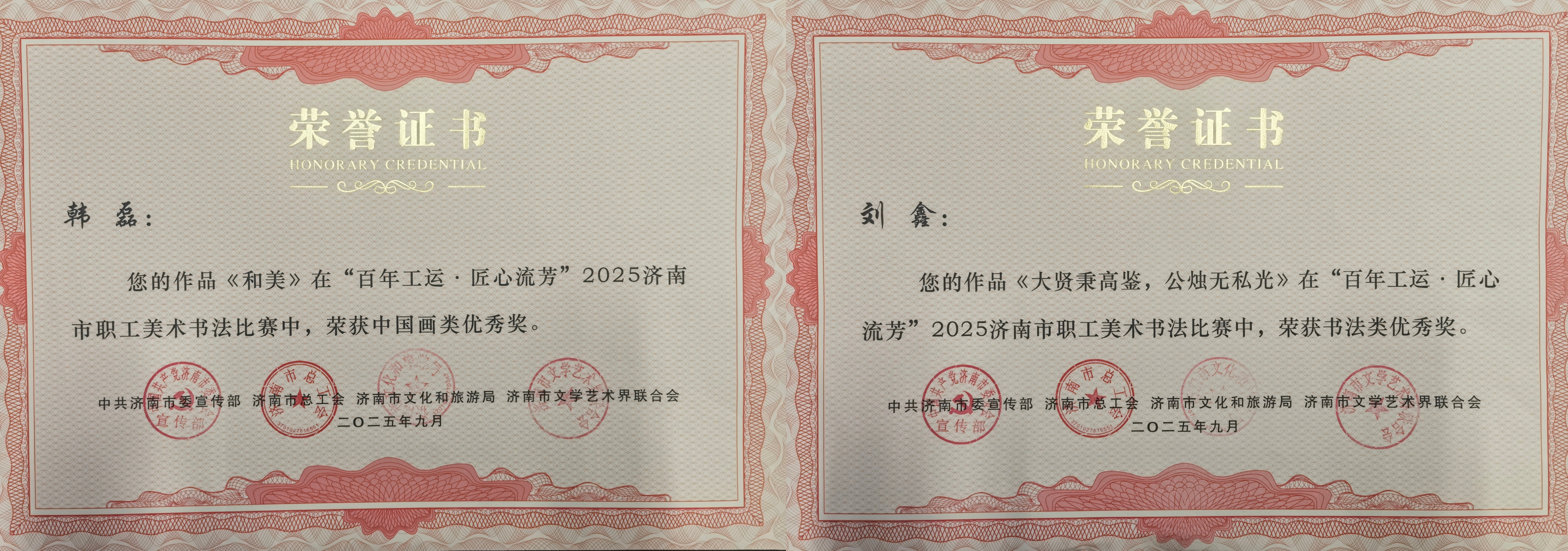 近日,由中共济南市委宣传部、市总工会等部门联合主办的“百年工运·匠心流芳”2025济南市职工美术书法比赛圆满落幕。市科技局工会积极响应、精心组织,选送的三幅作品在比赛中表现优异,其中中国画作品《和美》荣获中国画类优秀奖,书法作品《大贤秉高鉴,公烛无私光》荣获书法类优秀奖,展现了科技系统职工良好的文化素养和精神风貌。