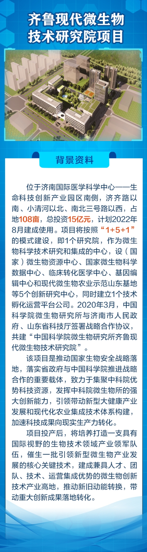 本网讯:【社会发展科技处 报道】9月28日上午,齐鲁现代微生物技术研究院项目开工仪式举行。前期,我局密切联系中国科学院微生物研究所和山东省科技厅,一致达成合作协议。3月11日下午,济南市政府、山东省科技厅、中国科学院微生物研究所合作共建项目签约活动在线举行。