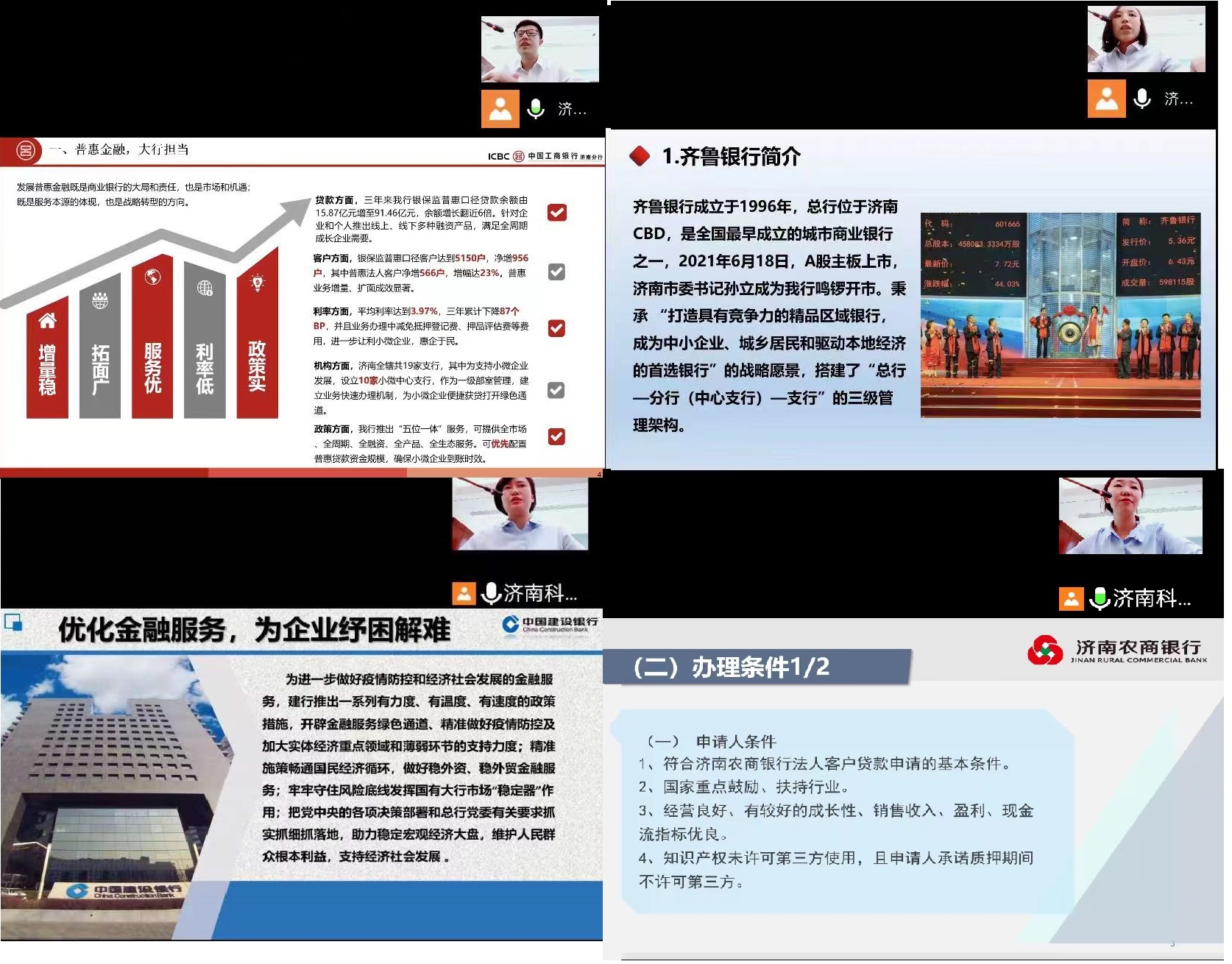 为发挥金融支持科技创新重要作用,帮助科技型中小企业积极应对疫情冲击,缓解资金压力,拓宽科技型中小企业融资渠道,解决企业融资难题。济南科技创新促进中心邀请中国银行济南分行、工商银行济南分行、建设银行济南分行、农商银行济南分行、北京银行济南分行、齐鲁银行济南科创支行、青岛银行济南分行等7家银行通过网络直播方式集中向我市科技企业宣传介绍科技金融信贷产品。