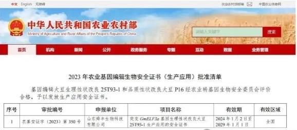 “今年1月,我们再次获得长童期大豆,也是国内第二张基因编辑生产应用安全证书,我们的技术创新和产品开发能力已经位居国内第一、国际领先的水平。”山东舜丰生物科技有限公司总经理张辉说。